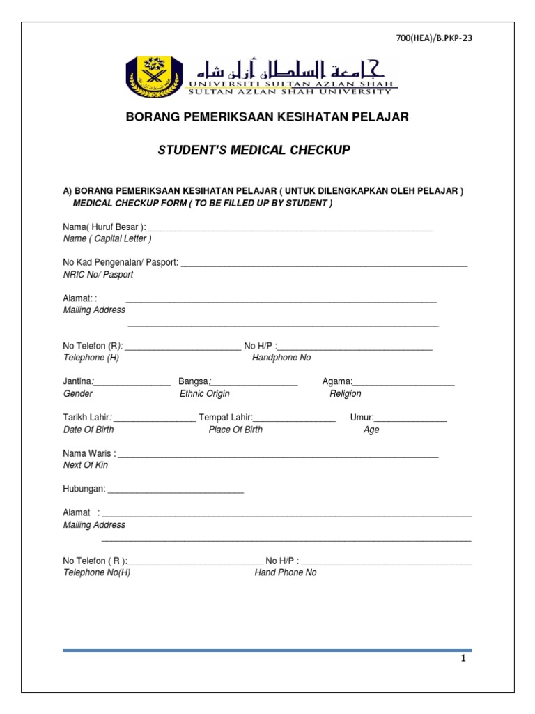 Borang medical check up untuk pelajar. Medical check up notice. Kepada semua pelajar kampus induk anda diwajibkan untuk menjalani pemeriksaan kesihatan medical check up termasuk pemeriksaan x ray dada di pusat sejahtera pusat kesihatan kampus induk usm anda dan juga semua rakan rakan seperjuangan akan diberi temujanji apabila anda melapor diri nanti. 1 2013 borang permohonan pemeriksaan perubatan untuk pelantikan ke dalam perkhidmatan awam pemohon hendaklah mengisi maklumat di bahagian a b dan dan menyerahkan borang ini c berserta surat tawaran pelantikan kepada pengamal perubatan berdaftar sebelum pemeriksaan perubatan dibuat. Borang pemeriksaan kesihatan pelajar pps 13 borang pendaftaran kursus.