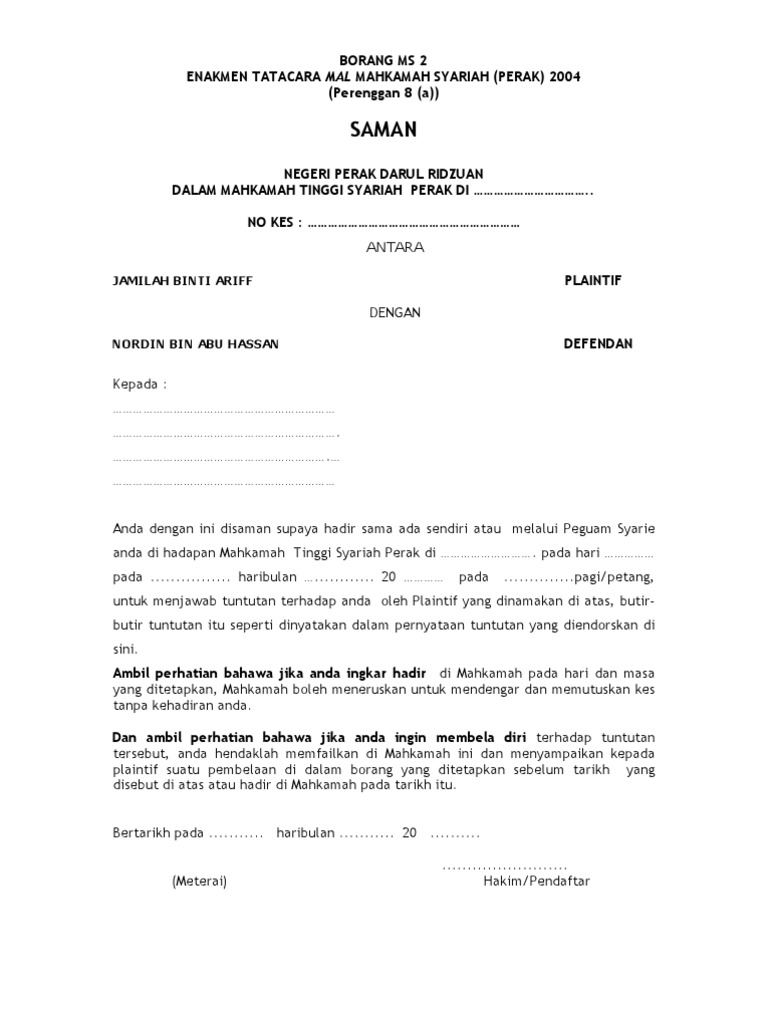 Borang ms 1 akta tatacara mal mahkamah syariah wilayah wilayah persekutuan 1998 seksyen 4 tajuk am. Enakmen tatacara mal mahkamah syariah negeri selangor 2003. Contoh borang saman dan penyata tuntutan borang ms 2 enakmen tatacara mal mahkamah syariah negeri pulau pinang 2004 seksyen 8 a saman di dalam mahkamah tinggi syariah pulau pinang. Belum ada laporan dan tindak lanjut atas temuan iso 2nd stage akar penyebab.