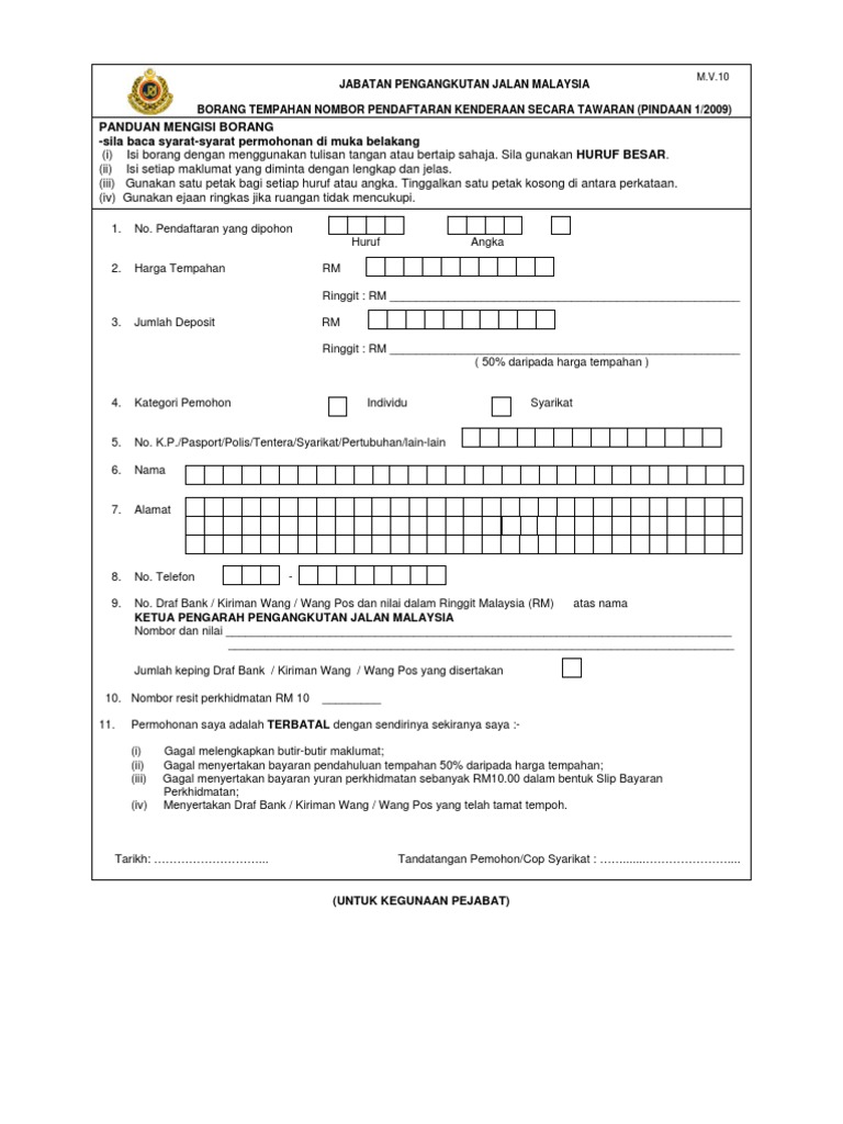 Borang mv 10. Nombor menarik bermula rm2 000 dan nombor popular bermula rm300 katanya yang dihubungi hari ini. 10 boleh didapati di pejabat pengangkutan jalan negeri cawangan atau laman web jpj www jpj gov my. 2 1 borang tempahan nombor pendaftaran secara tawaran m v. Search covid 19 stats updates disclaimer.