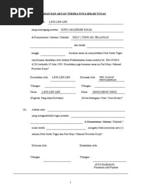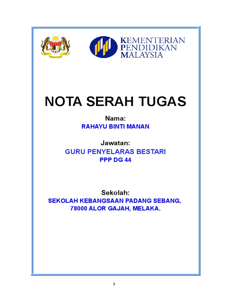 Kedudukan kewangan akaun dan lain lain. Nota serah tugas guru lengkap baru baru ini telahpun diumumkan keputusan permohonan pertukaran guru bagi sesi januari 2018. Disertakan juga bersama sama ini fail meja manual prosedur kerja. A adalah saya nasaruddin bin darus yang memegang jawatan guru penolong di kementerian jabatan sekolah kebangsaan chepir dari tarikh 1 1 2006 hingga 16 februari 2019.