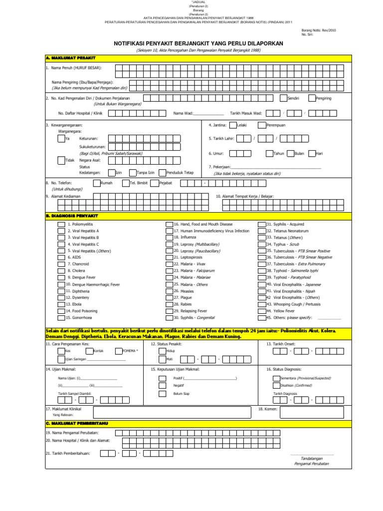 Borang notifikasi penyakit berjangkit 2010. Borang notifikasi influenza a h1n1 anex 1. Garis panduan penyakit bawaan makanan dan air. Tbis 20a2 borang penilai semula slaid controller 1 tbis 20a3 borang penilai semula slaid controller 2 tbis 102c rekod blinded coding slaid penilai semula tbis 202a2 laporan aktiviti eqa br. Sehubungan itu bahasa dan kandungan portal tersebut tidak.