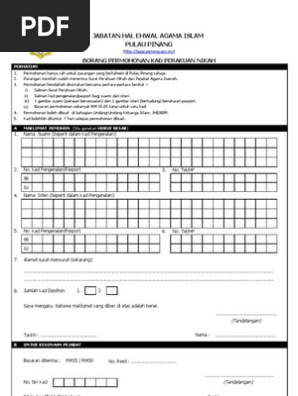 Pemohon yang melangsungkan akad nikah di pulau pinang dikehendaki mengisi borang kad nikah dan bayaran adalah rm60 00 2 keping kad. Ujian saringan hiv dapatkan borang laporan kesihatan untuk bakal pengantin borang hiv di pejabat agama daerah berdekatan atau boleh muat turun di sini. Secara amnya melalui prosedur ini pasangan lelaki dan perempuan yang sama daerah perlulah menghantar borang nikah online yang lengkap bersama lampiran yang dikehendaki kepada pejabat agama 30 hari sebelum tarikh nikah. Bayaran bagi satu majlis akad nikah ialah rm130 00 yang perlu dibayar kepada penolong pendaftar nikah juru nikah selepas akad nikah berlangsung.