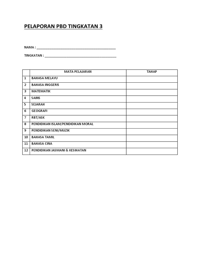 Borang pbd tingkatan 3. Templat pelaporan pbd tingkatan 3 adalah sebahagian daripada komponen di dalam pentaksiran berasaskan sekolah pbs tingkatan 3. Kssm ini akan bermula pada tahun 2017 untuk pelajar tingkatan satu 2018 bagi pelajar tingkatan 2 dan seterusnya sehingga 2021 bagi pelajar tingkatan 5. Bermula tahun 2019 ini tingkatan 3 akan mengguna pakai pelaporan pbd yang berdasarkan dokumen dskp yang terkini. Bermula tahun 2019 ini tingkatan 3 akan mengguna pakai pelaporan pbd yang berdasarkan dokumen dskp yang terkini.