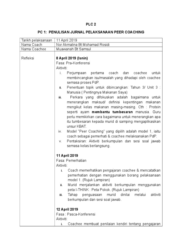 Koleksi bahan peer coaching plc admin december 9 2018 komuniti pembelajaran professional plc kerap dirujuk sebagai sekumpulan guru guru yang bertemu secara kerap berkongsi pengalaman dan kepakaran untuk mempertingkatkan kemahiran pengajaran dalam usaha meningkatkan pencapaian pelajar dufour et al. Contoh laporan plc teacher sharing jurnal peer coaching dalam entri saya yang sebelum ini strategi tips borang pelaksanaan plc saya sudah kongsikan senarai borang yang perlu ada dalam laporan plc bagi setiap strategi yang dijalankan. Setiap strategi plc lesson study peer coaching learning walk teacher sharing session video critique yang telah cikgu jalankan boleh didaftarkan sebagai tiga jam ldp. Proses perbincangan lebih meluas dan lebih fleksibel.