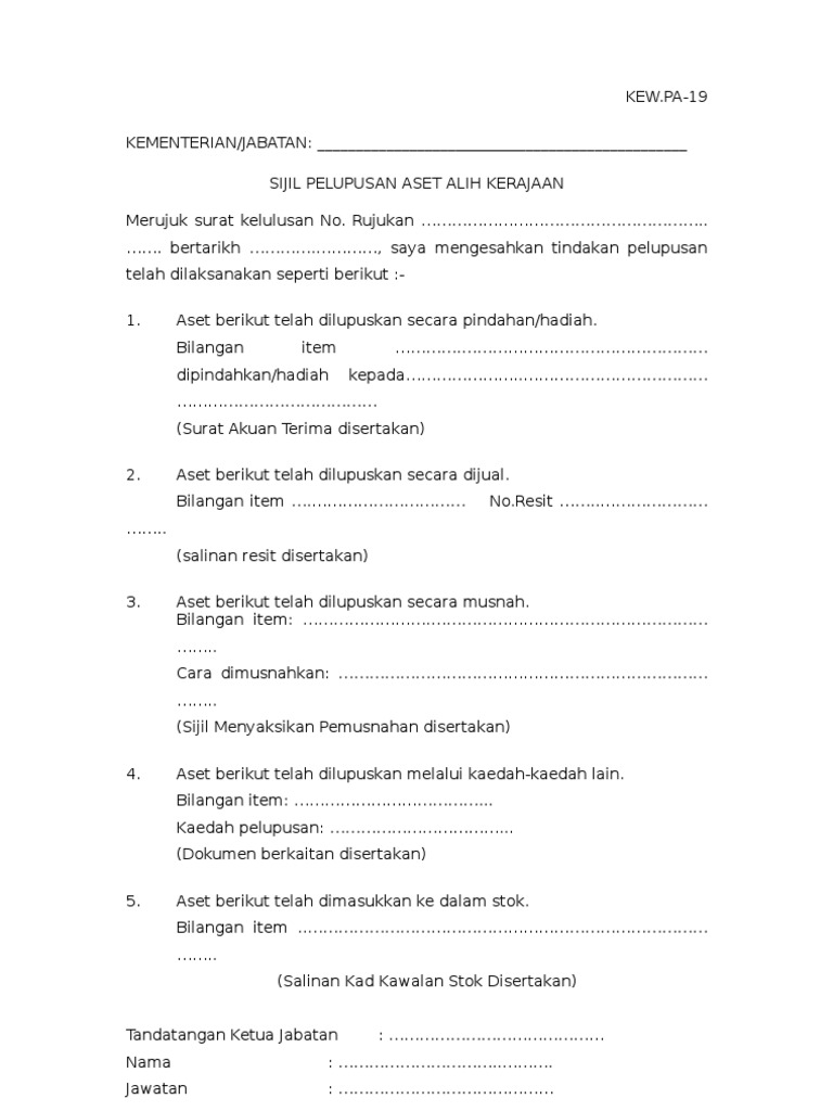Borang pelupusan aset alih kew pa 19. Kew 1 pa 19 sijil pelupusan aset alih tv2013 norlizajais. 30 kew pa 30 laporan akhir kehilangan aset alih sk jalan haji baki. 19 am 2 3 am 2 1 am 2 2 am 2 4 am 1 1 am 2 5 tatacara pengurusan aset alih kerajaan pendaftaran. Bagi tender antarabangsa bermula dari tarikh tender ditutup.