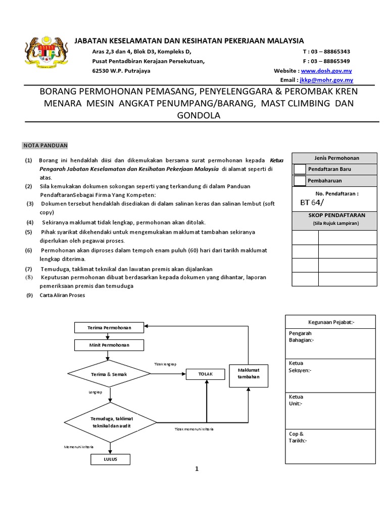 Jkkp department of occupational safety and health malaysia dosh. 00 4 1 1 surat permohonan surat permohonan hendaklah disertakan dengan menyatakan tujuan dan skop permohonan pendaftaran firma yang kompeten. 00 kandungan muka surat 1 0 pengenalan 3 2 0 tujuan 3 3 0 takrif 4 4 0 pendaftaran sebagai firma yang kompeten 4 4 1 dokumen permohonan 5 4 1 1 surat permohonan 6 4 1 2 borang pendaftaran firma yang kompeten 6 4 1 3 latar. Jabatan keselamatan dan kesihatan pekerjaan jkkp page 5 of 20 bil.