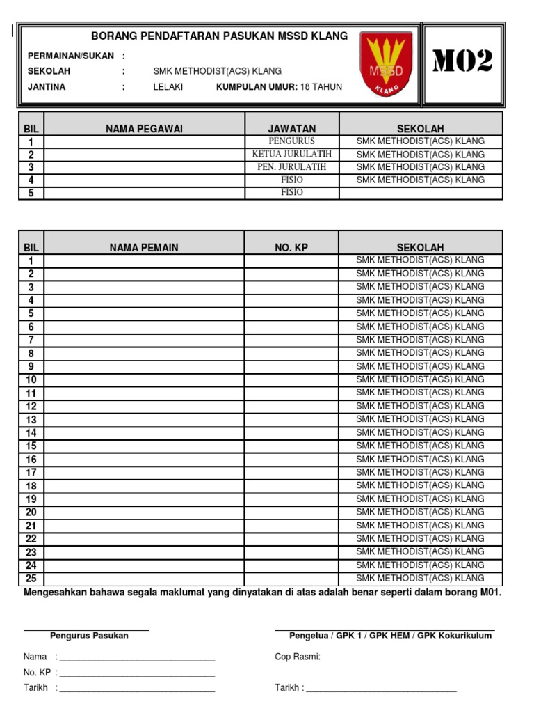M02 bil nama pegawai jawatan sekolah 1 2 3 4 5 6 bil nama pemain no. Borang pendaftaran pasukan mssm m02 permainan sukan. Bawah 18bil nama pegawai jawatan sekolah 1 guru smk tanah merah 2 guru smk tanah merah 3 guru smk tanah merah 4 5 6bil nama pemain no. Borang pendaftaran individu permainan sukan.