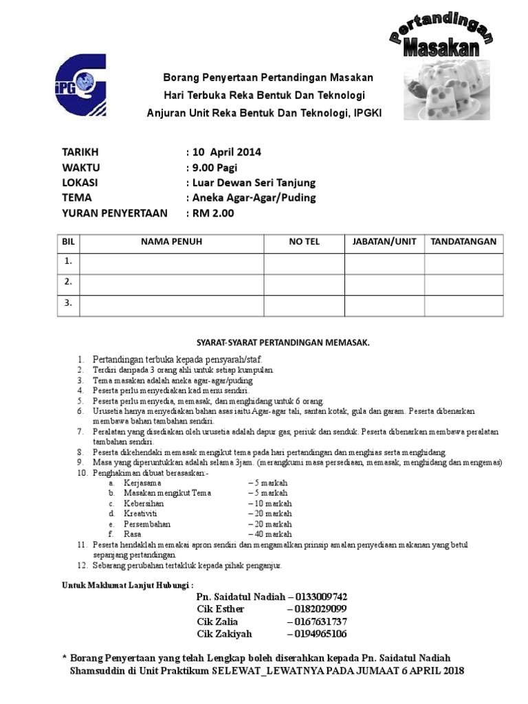 Borang pendaftaran pertandingan memasak. Borang yang telah lengkap perlu di hantar kepada sn. You are on page 1 of 2. Penghantaran penyertaan 18 julai 14 ogos 2016. Tarikh pertandingan adalah pada 17 november sabtu seperti yang berikut 8 00 9 00 pagi.