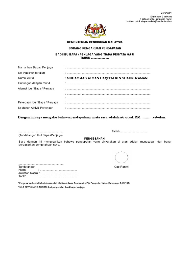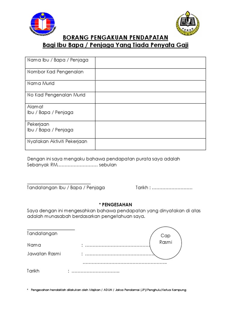 Diisi oleh ibu bapa penjaga. Borang pengakuan pendapatan bagi ibu bapa penjaga yang tiada penyata gaji tahun 2019 diisi oleh ibu bapa penjaga bahagian a. Borang pengakuan pendapatan bagi ibu bapa penjaga yang tiada penyata gaji tiada pendapatan untuk tahun diisi oleh ibu bapa penjaga 1. Pengerusi jkkk penyelia pembangunan mukim penghulu bagi negeri kelantan ialah penggawa pemanca ketua kampung dan yang setaraf dengannya berdasarkan pengakuan pendapatan yang disertakan bersama.