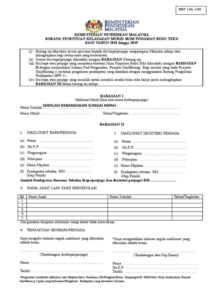 Pendapatan keluarga pada tahap rendah atau sederhana. Kementerian pendidikan malaysia aras 3 4 blok e2 kompleks e pusat pentadbiran kerajaan persekutuan 62604 wilayah persekutuan putrajaya tel. Sistem pemprosesan stam online estam sistem pentaksiran alternatif sekolah rendah pasr sistem pendaftaran atas talian spatkpm aplikasi pangkalan data murid apdm sistem pelaporan isu disiplin dan pendidikan e pidp. Kementerian pendidikan malaysia borang penentuan kelayakan murid skim pinjaman buku teks bagi tahun 200 hingga 200 i borang ini diberikan secara percuma kepada ibu bapa penjaga warganegara malaysia sahaja dan dilengkapkan bagi setiap anak yang bersek olah.