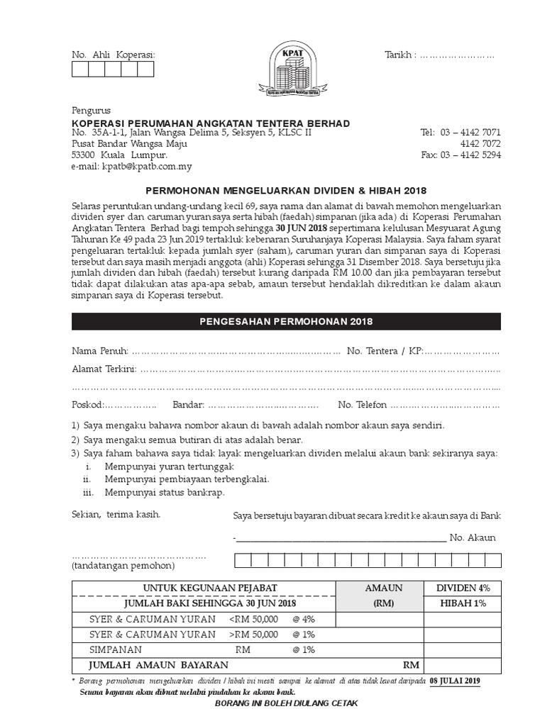 Blog maklumat borang pengeluaran simpanan koperasi tentera online online berita semakan keputusan pendidikan permohonan dan isu semasa. Pembayaran dividen itu adalah berdasarkan keuntungan sebelum cukai dan zakat koperasi tentera sebanyak rm184 3 juta hasil daripada pendapatan bersih operasi bagi tahun kewangan. Jangan biarkan anda memiliki yuran tertunggak atau pinjaman yang juga tertunggak jikalau anda tidak mahu pengeluaran dividen mendapat masalah. Borang permohonan berhenti.