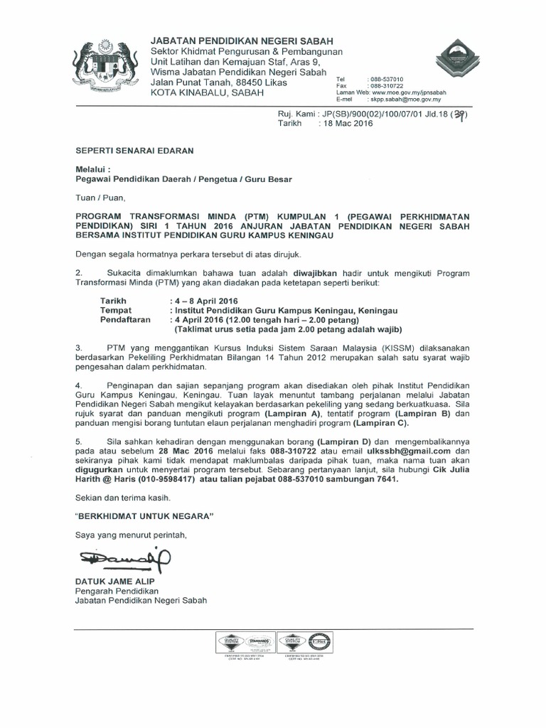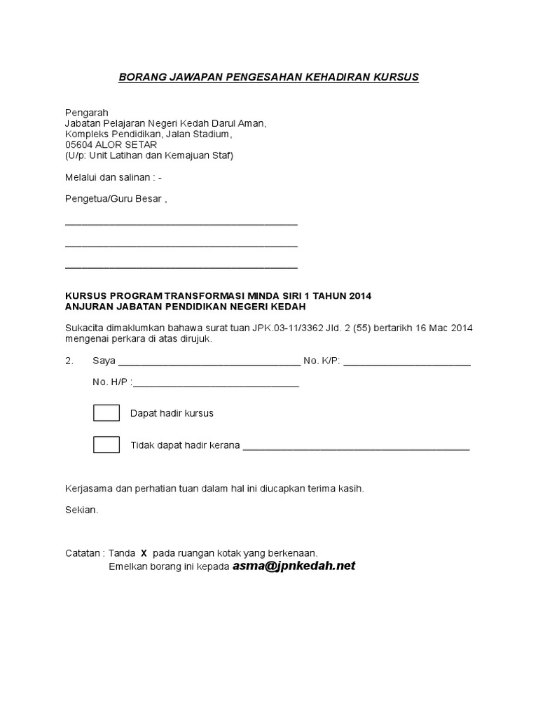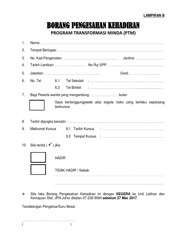 Sebelum atau pada. Pengesahan kehadiran ptm sila kembalikan borang pengesahan kehadiran ptm di lampiran a yang telah lengkap diisi ke bahagian pengurusan latihan bpl kkm pada atau sebelum 18 februari 2015 di alamat e mail seperti berikut. Borang program tranformasi minda ptm perhatian. Sila fakskan borang pengesahan kehadiran di talian.