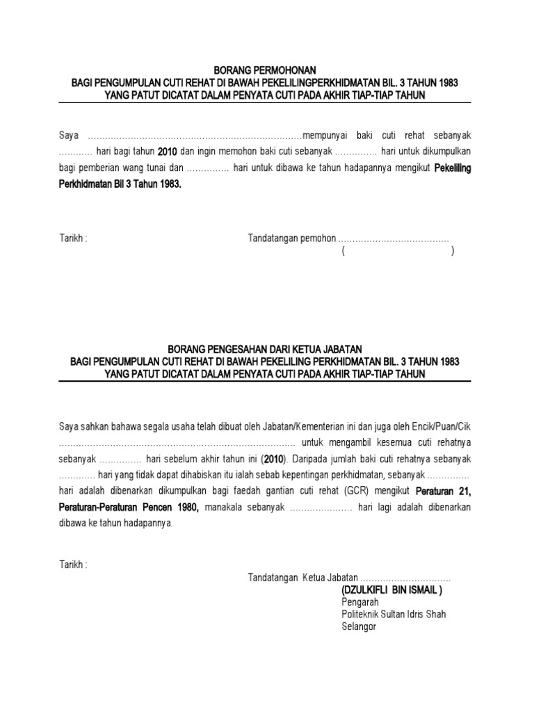 Walau bagaimanapun borang kebenaran pengumpulan cuti rehat adalah seperti di. Borang kebenaran pengumpulan gcr seperti di lampiran a. Dicatat oleh ombak73 di. Bilangan 7 tahun 2003.