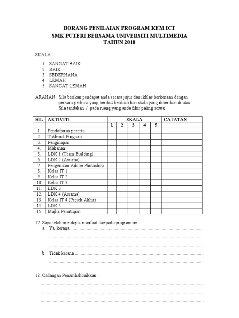 Beranda pendataan borang penilaian kinerja lembaga kursus tahun 2009. Secara keseluruhan bagaimana anda menilai modul ini. Penilaian keseluruhan kursus 1. Maklumat asas 1 1 nama kursus seminar bengkel lawatan.