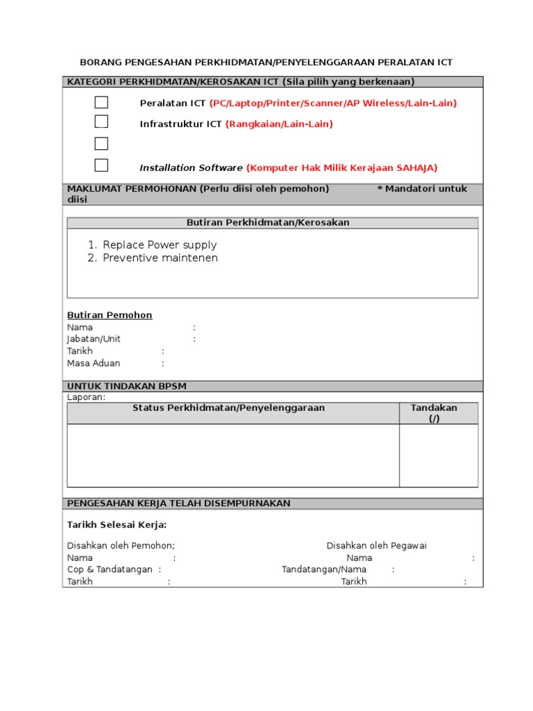 02 tarikh kuatkuasa 07 02 2020 borang ini digunakan bagi penyelenggaraan peralatan mesin jentera dan infrastruktur penyelenggaraan baik pulih penyelenggaraan berkala lengkapkan perkara 1 dan 3 b 1. 01 06 2017 muka surat. Penyelenggaraan bangunan kemudahan dan peralatan pejabat no.