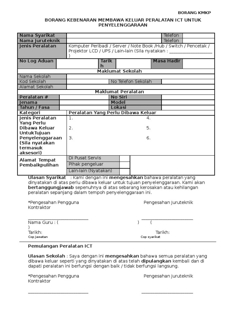 Borang penyelenggaraan berkala komputer teknikal ict smk taman tasik lokasi. 4 2 penyelenggaraan komputer penyelenggaraan komputer secara komprehensif iaitu melibatkan pencegahan dan pemuliharaan. Aset yg memerlukan penyelenggaraan perlu dikenal pasti dan direkodkan dalam borang aset penyelenggaraan. Peralatan yang tidak didaftarkan sebagai hak milik kerajaan adalah tanggungan sendiri.