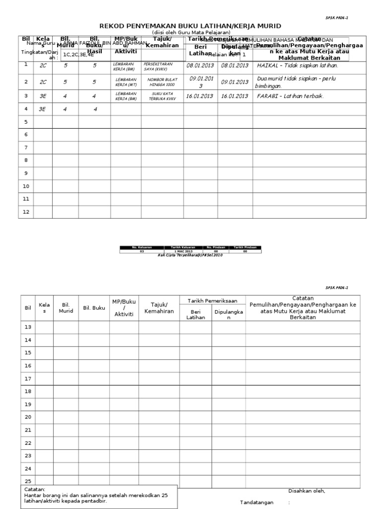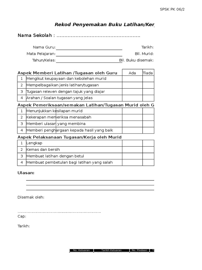 Borang penyemakan buku latihan murid. Teknik ingatan kaedah mengatasi lupa lemah ingatan. Kerja murid yang disahkan oleh pengetua gurubesar dan diedarkan kepada semua guru 5 5 mengumpul dan menyerahkan semua buku latihan murid dan melengkapkan borang untukdipantau oleh pentadbir mengikut jadual yang ditetapkan 5 6 pentadbir mengesahkan penerimaan semua buku. Borang sinopsis buku latihan dalam perkhidmatan ldp nama sekolah 1 2. Download rpp silabus prota prosem kkm sk kd ktsp 2006 sd kelas 5.