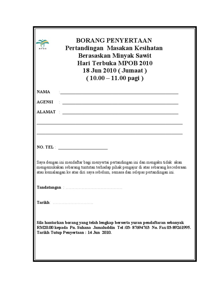 Borang penyertaan pertandingan memasak. Mase wat pengumuman untuk pertandingan memasak ni mcm xconfidentje rmai x penyertaan jd sy limitkan pd 8 kmpln shj setiap kmpln terdiri dri peserta. Borang penyertaan bagi pertandingan memasak secara langsung ikan gift tilapia air tawar terbuka kepada jabatan agensi persatuan kelab pada 24 oktober 2015 bersamaan hari sabtu sempena hari peladang penternak dan nelayan negeri sabah 2015 1 0 nama calon peserta 3 orang dalam 1 pasukan 1 1 ketua tukang masak nama peserta. Terma dan syarat peraduan. 5 kumpulan staf dan 5 kumpulan pelajar terawal akan dipilih 3.