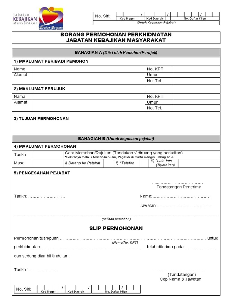 Anda perlu memuat turun borang berikut dan menghantar permohonan menggunakan borang secara manual di pejabat kebajikan masyarakat daerah jajahan bahagian jabatan kebajikan masyarakat negeri yang berdekatan dengan kawasan masing masing. Dasar pelan tindakan. Muat turun borang permohonan pendaftaran orang kurang upaya berikut adalah pautan kepada borang pendaftaran oku. Borang permohonan perkhidmatan jabatan kebajikan masyarakat bahagian a diisi oleh pemohon perujuk 1 maklumat peribadi pemohon nama no.