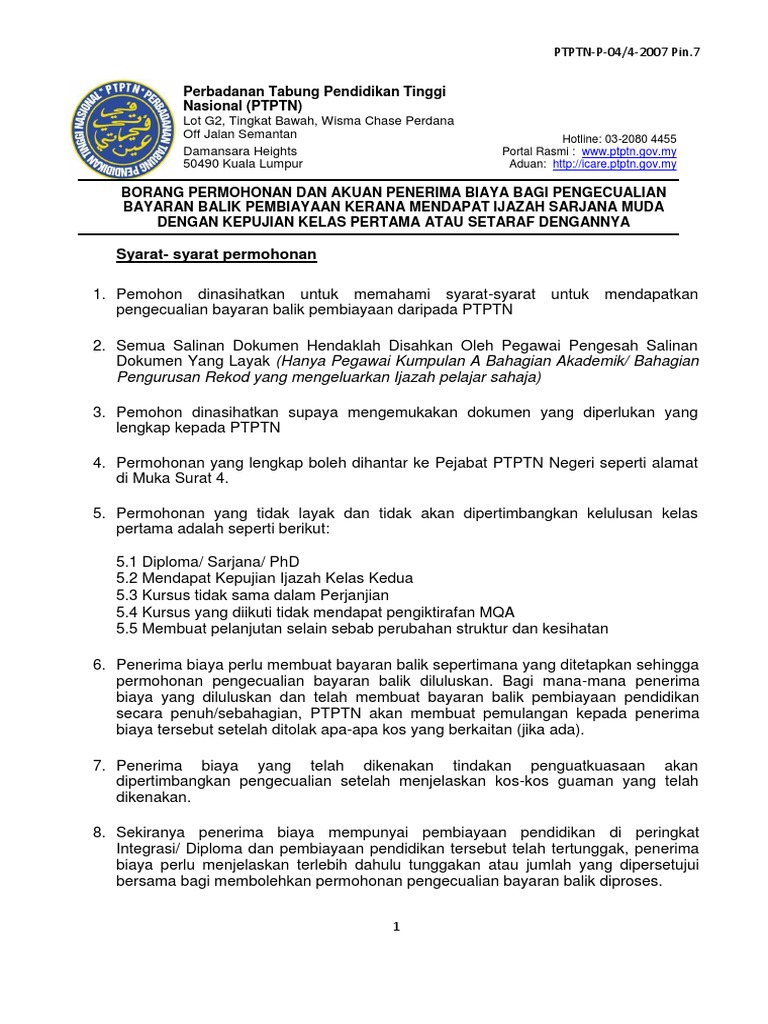 Ptptn p 01 3 2004 pin 2 perbadanan tabung pendidikan tinggi nasional borang permohonan perlanjutan tempoh pinjaman pendidikan a. Bagi mana mana penerima biaya yang diluluskan dan telah membuat bayaran balik pembiayaan pendidikan secara penuh sebahagian ptptn akan membuat pemulangan kepada penerima biaya tersebut setelah ditolak apa apa kos yang berkaitan jika ada. Penerima biaya perlu membuat bayaran balik sepertimana yang ditetapkan sehingga permohonan pengecualian bayaran balik diluluskan. 03 2098 3769 no.