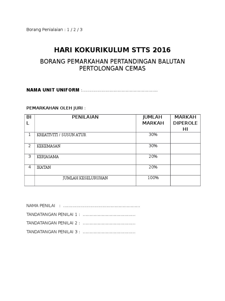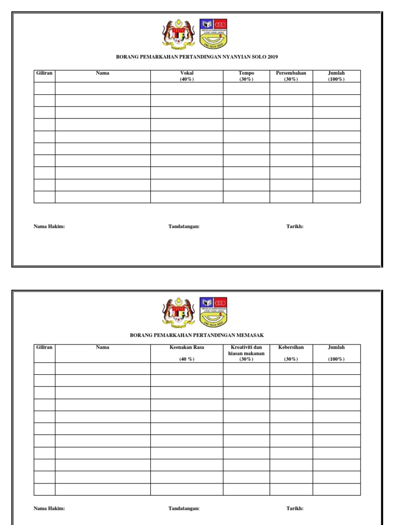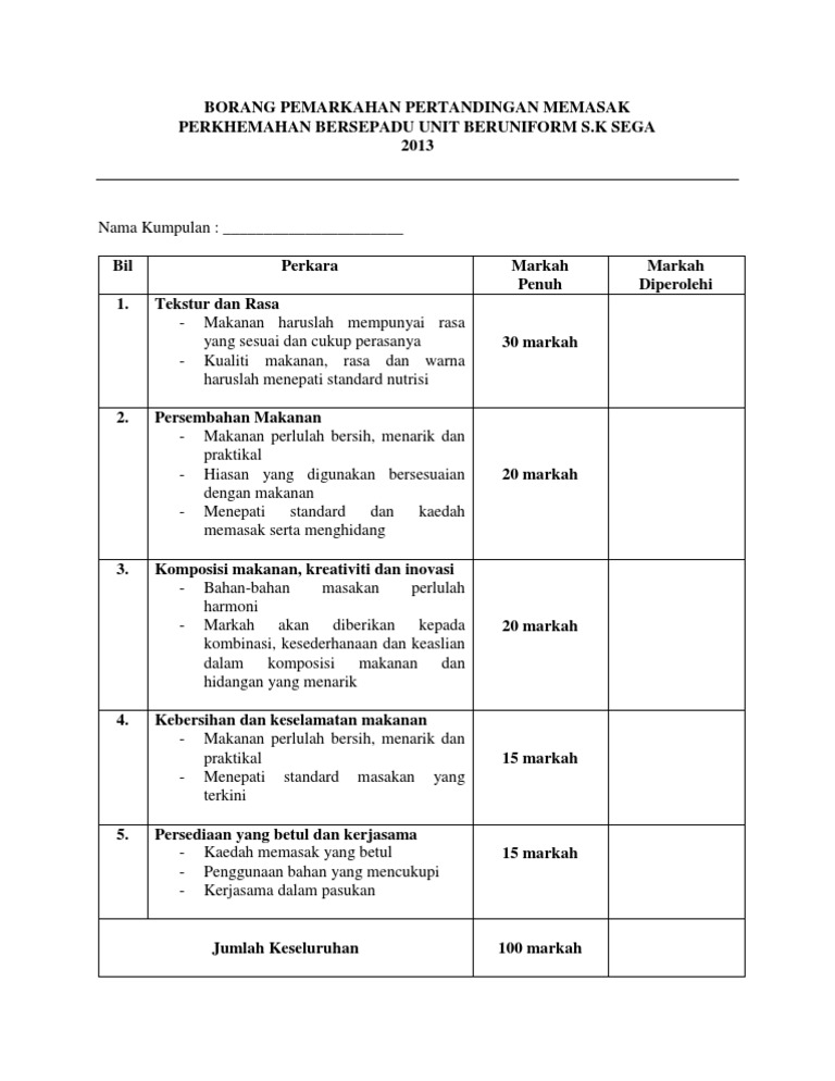 Borang pemarkahan pertandingan memasak. Search inside document. Konsep masakan ala rimba. Hari nie saya bawa peserta ke pertandingan memasak yg ditaja maggi dan nestle bagi peringkat daerah larut matang selama bertempat di smk p treacher methodist.