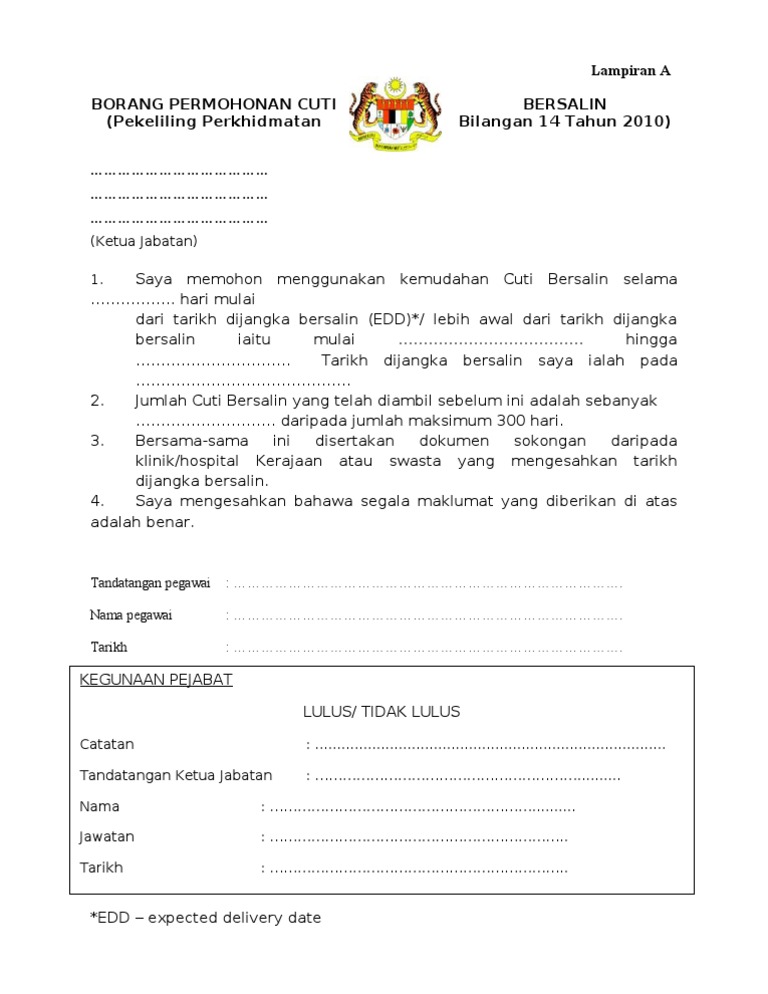 Saya memohon menggunakan kemudahan cuti bersalin selama hari mulai dari tarikh dijangka bersalin edd lebih awal dari tarikh dijangka bersalin iaitu mulai hingga. Perakuan bersalin surat dijangka bersalin hendaklah dilampirkan. Alamat tempat tinggal semasa cuti bersalin. Kemudahan cuti bersalin telah diperuntukkan kepada pegawai warganegara.
