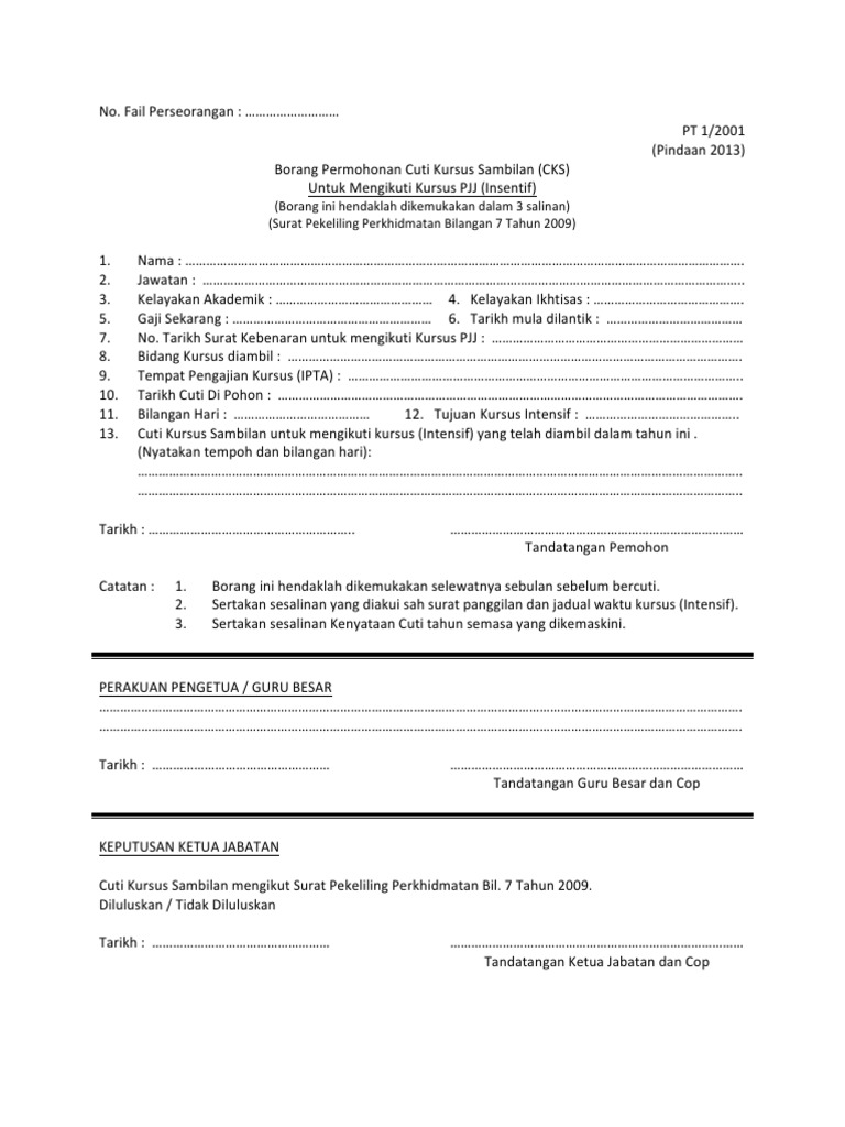 Borang permohonan cuti kursus sambilan cks. Keputusan ketua jabatan cuti tanpa rekod diluluskan tidak diluluskan mulai. Pt 1 2001 pindaan 2013 borang permohonan cuti kursus sambilan cks untuk mengikuti kursus pjj insentif borang ini hendaklah dikemukakan dalam 3 salinan surat pekeliling perkhidmatan bilangan 7 tahun 2009. Jabatan perkhidmatan awam malaysia. Borang 1 spp bil.