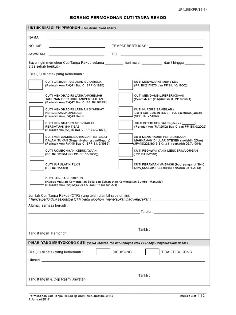 Borang permohonan cuti tanpa rekod menghadiri peperiksaan. Cuti menghadiri latihan syarikat kerjasama e. Maklumat pegawai 1 nama. Cuti latihan pasukan sukarela c. Maklumat cuti tanpa rekod 5 tujuan permohonan.