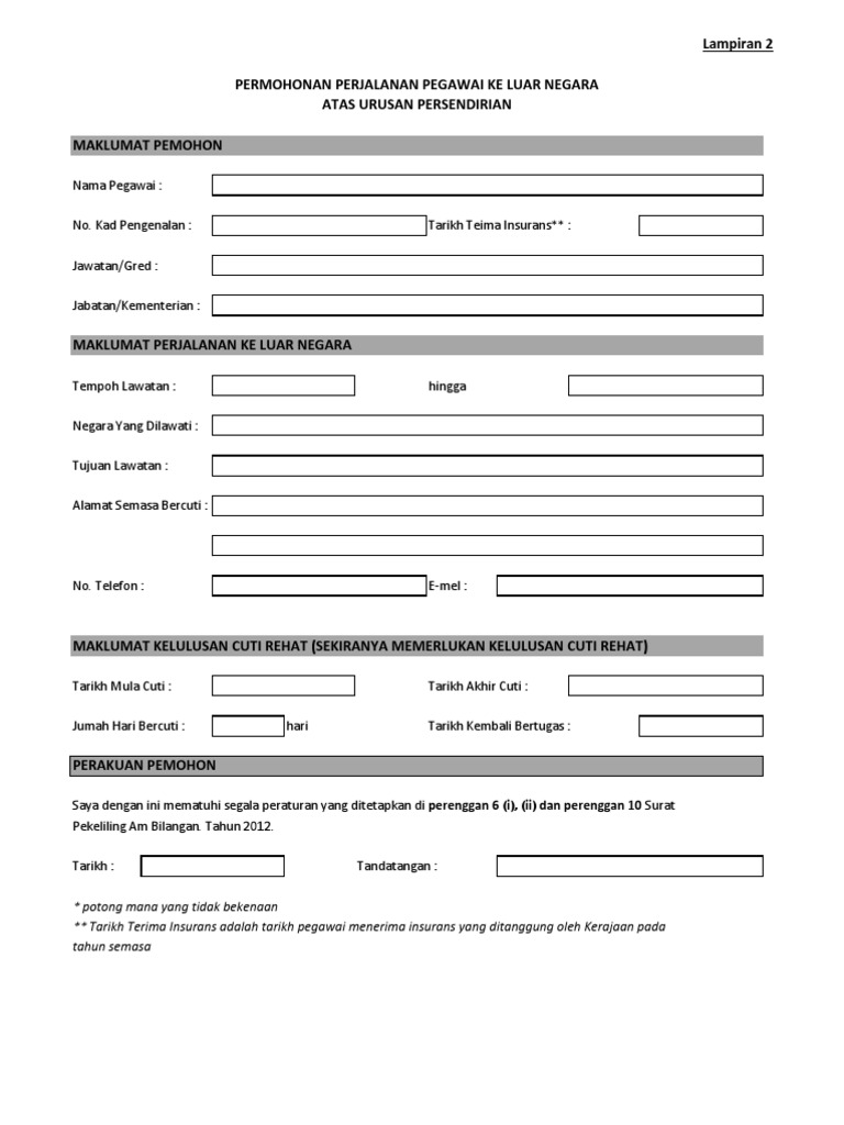 Borang permohonan pegawai awam ke luar negara atas urusan persendirian namanya. Maklumat kelulusan cuti rehat sekiranya memerlukan kelulusan cuti rehat tarikh mula cuti. Capaian garis panduan dan borang permohonan ke luar negara persendirian adalah seperti berikut. Maklumat perjalanan ke luar negara tempoh lawatan.