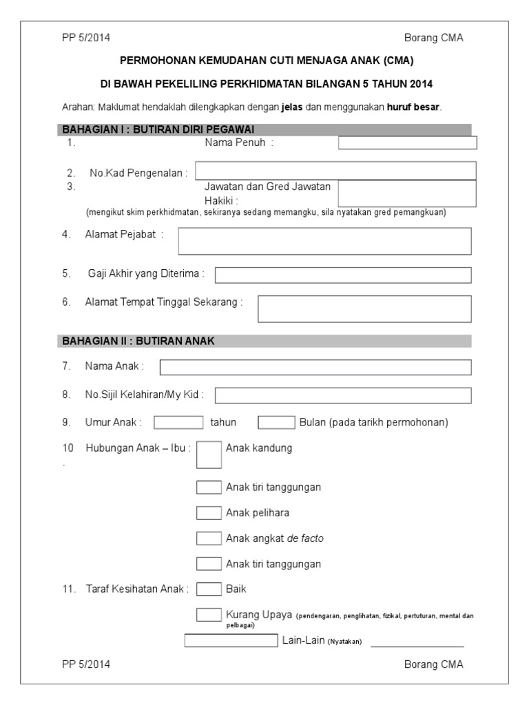 Baki cuti menjaga anak selepas diluluskan permohonan ini. Maklumat hendaklah dilengkapkan dengan jelas dan menggunakan huruf besar. Permohonan kemudahan cuti menjaga anak cma di bawah pekeliling perkhidmatan bilangan 5 tahun 2014 arahan. Maklumat hendaklah dilengkapkan dengan jelas dan menggunakan huruf besar.