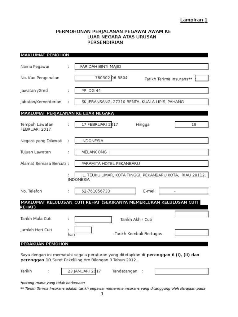 Untuk mengyistihar perjalanan tersebut anda perlu mengisi borang permohonan perjalanan pegawai awam ke luar negara atas urusan persendirian. Pengesahan ketua bahagian permohonan pegawai di atas disokong tidak disokong. Atas urusan persendirian lampiran 2. Borang permohonan perlindungan insurans kesihatan ke luar negara negara ketiga borang permohonan kemudahan perlindungan insurans kesihatan ke luar negara negara ketiga atas urusan persendirian di bawah pekeliling perkhidmatan bilangan 6 tahun 2015 arahan.