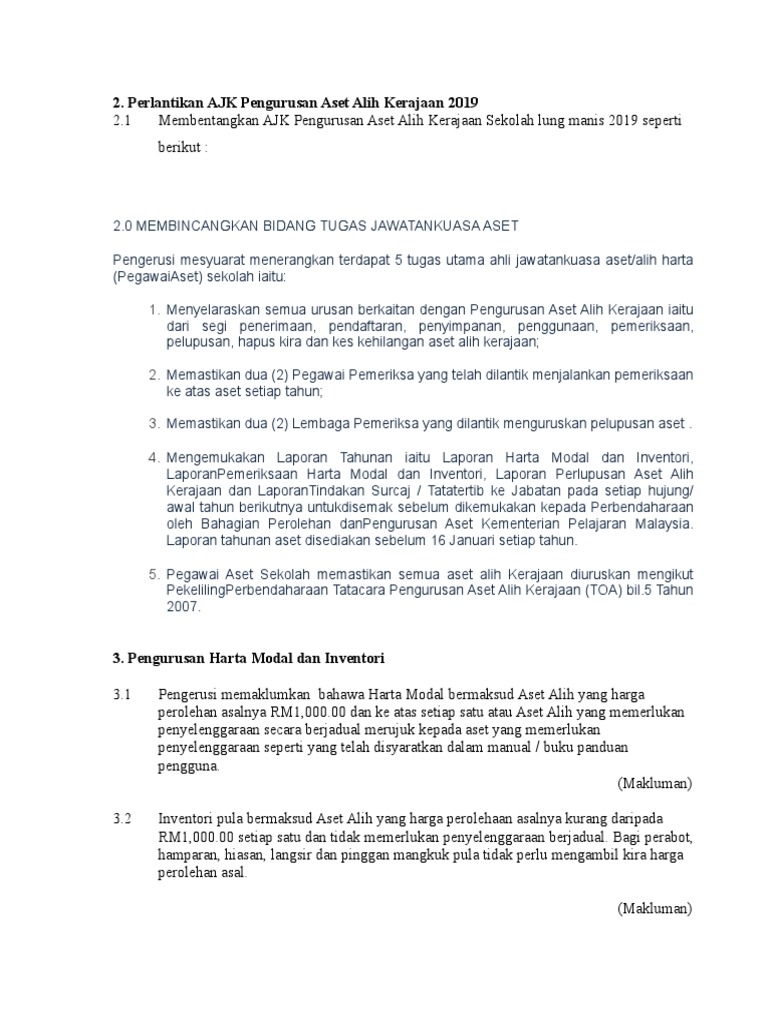 Garis panduan pelupusan aset kerajaan q surat pekeliling perbendaharaan bil. Microsoft word document 27 5 kb. Pdf surat arahan penyediaan laporan tahunan pengurusan aset kpm tahun 2019 pdf 121 kb. Cadangan penambahbaikan dalam mksp.