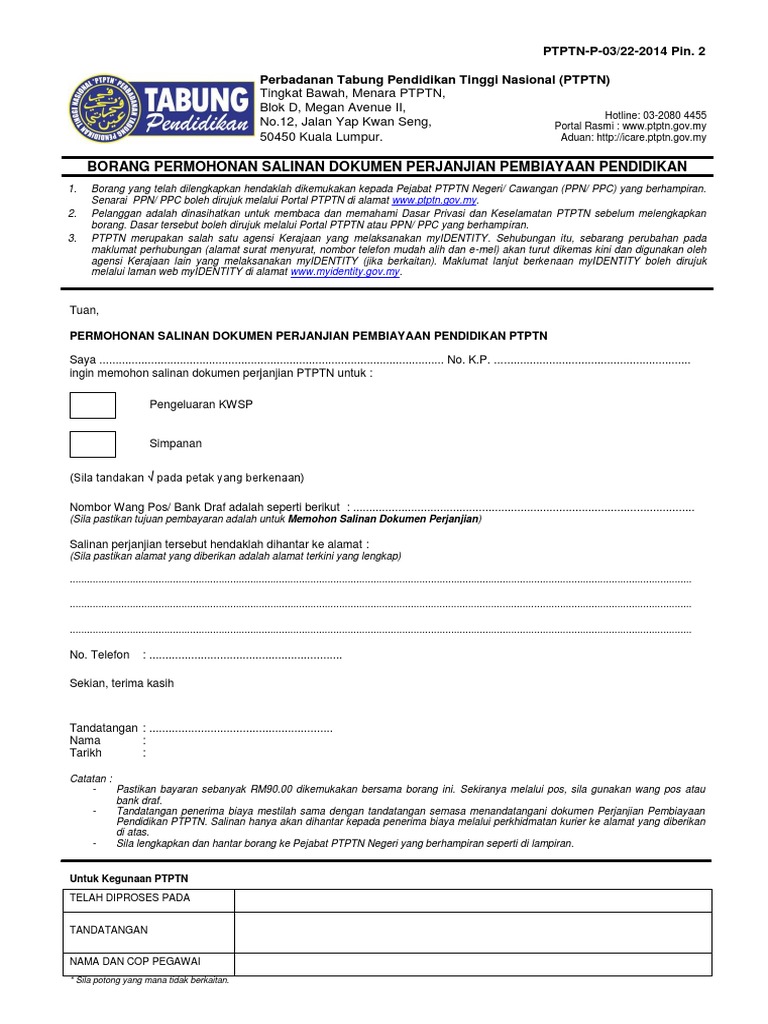 Borang permohonan pembiayaan ptptn. 3 50450 kuala lumpur. Ianya merupakan antara dana pendidikan terbesar di dunia dan lebih 2 8 juta rakyat malaysia telah mendapat manfaat daripada bantuan yang disediakan. Bagi mana mana penerima biaya yang diluluskan dan telah membuat bayaran balik pembiayaan pendidikan secara penuh sebahagian ptptn akan membuat pemulangan kepada penerima biaya tersebut setelah ditolak apa apa kos yang berkaitan jika ada. Borang permohonan dokumen perjanjian pinjaman asal yang tidak dituntut.