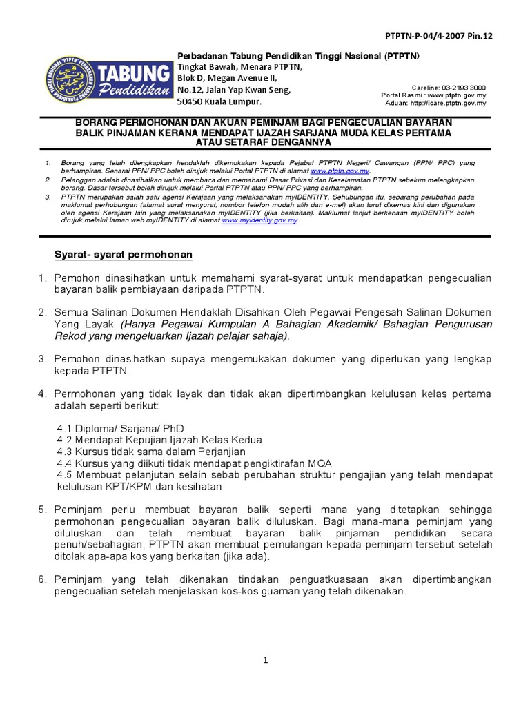 Borang permohonan pengecualian ptptn. 03 2193 1263 e aduan. I online perbadanan tabung pendidikan tinggi nasional. Untuk makluman permohonan pengecualian bayaran balik ptptn untuk peminjam ijazah sarjana muda kelas pertama kini di buka. Sila hubungi careline ptptn ditalian 03 2193 3000 bagi mendapatkan no.