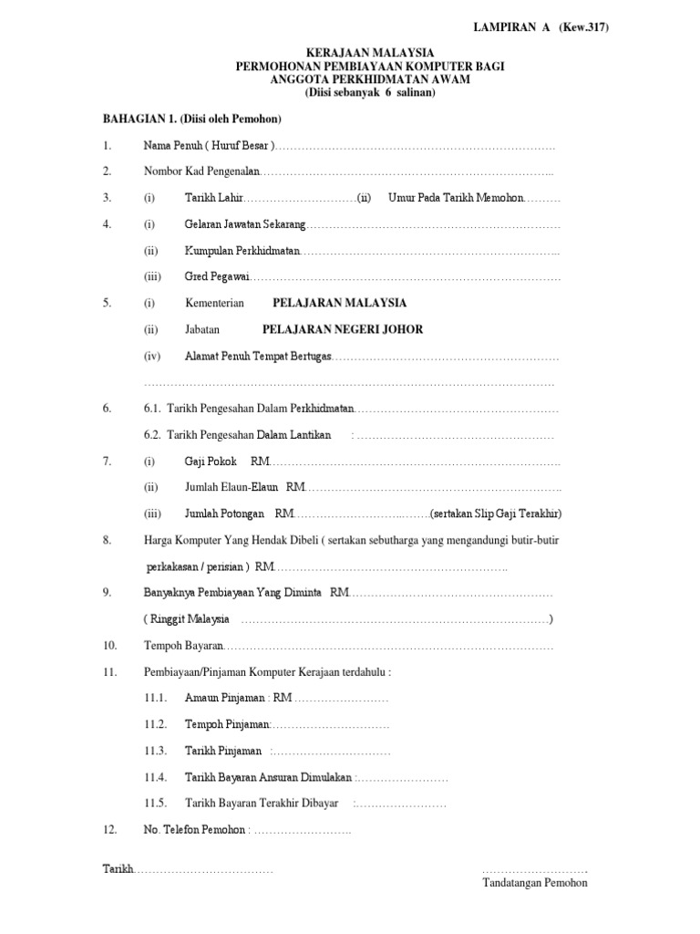Borang pinjaman komputer kew 317. Borang pinjaman pembiayaan harta butir peribadi ak 1 kew 322 yang telah dipenuhkan dikembarkan bersama sama ini. 317 pindaan 1 2011 kerajaan malaysia permohonan pembiayaan komputer bagi. 1 3 lampiran a kew. Pinjaman komputer syarat syarat pinjaman komputer dan dokumen dokumen yang perlu disertakan bersama sama borang permohonan ini ialah.