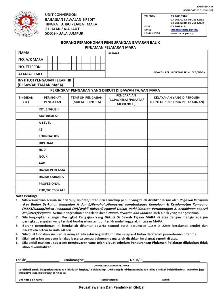 Merujuk kepada perkara di atas dan surat tuan puan bertarikh. Oleh kerana artikel terdahulu kami mengenai borang permohonan pengurangan pinjaman pelajaran mara online amat popular maka kami mengambil keputusan untuk membuat sedikit update kemaskini di sini mengenai topik tersebut. 318 lampiran b senarai semak yang digunakan untuk proses permohonan pinjaman komputer adalah seperti di lampiran c. Bagaimana cara memohon pinjaman perniagaan mara.