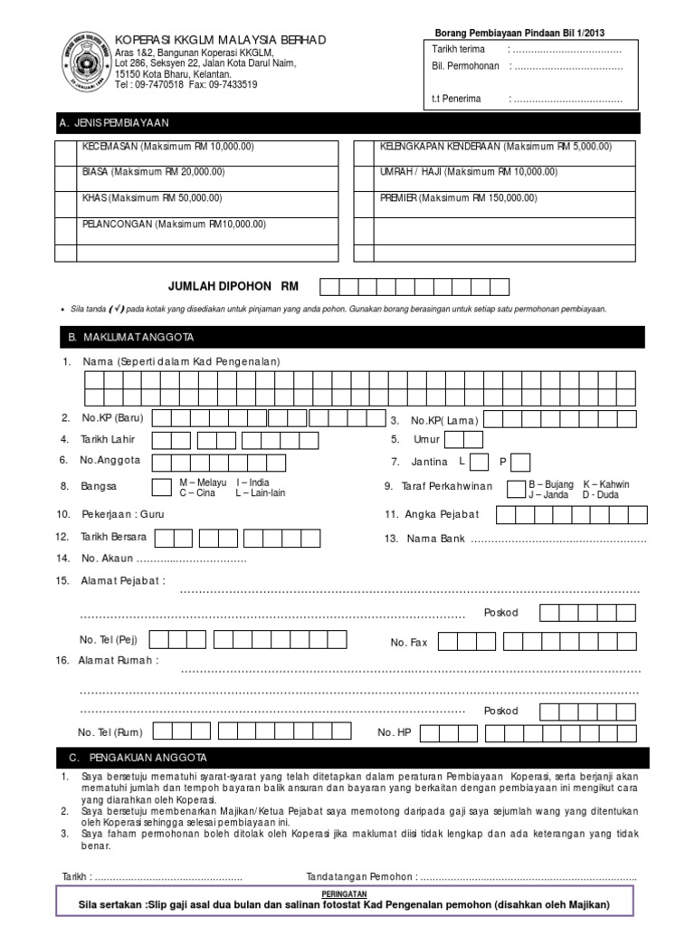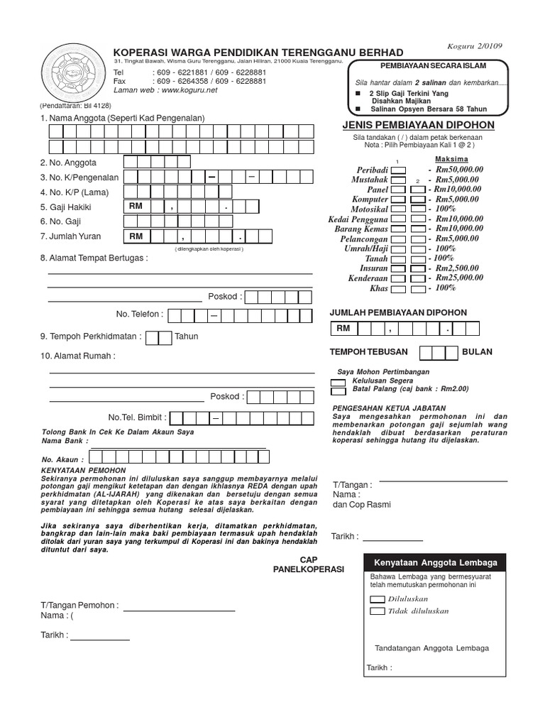 Borang pinjaman koperasi guru terengganu. Ianya menjadi pilihan utama guru di kedah yang berjawatan tetap bagi mendapatkan kemudahan pembiayaan peribadi dari koperasi berbanding dari bank bank tempatan yang turut menawarkan perkhidmatan yang sama. Ianya menjadi pilihan utama kakitangan kerajaan penjawat awam di terengganu yang berjawatan tetap bagi mendapatkan kemudahan pembiayaan peribadi dari koperasi berbanding dari bank bank. Sila upload file slip gaji berformat pdf sahaja atau email slip gaji terkini yang disahkan majikan email. Jenis jenis pembiayaan yang ditawarkan 5.