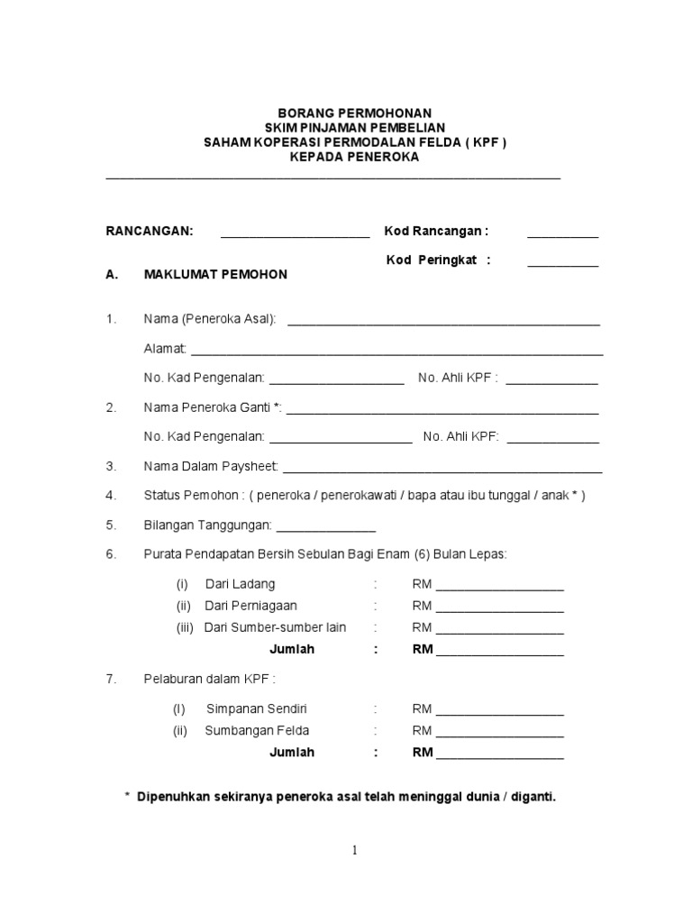 Borang pinjaman koperasi permodalan felda. Penubuhan kpf ini telah menyerlahkan hasrat murni felda untuk memberi peluang secara adil kepada warga felda untuk turut serta memiliki ekuiti dalam syarikat syarikat felda melalui kpf juga merupakan suatu wawasan prihatin felda untuk kemajuan warga felda. Koperasi permodalan felda malaysia berhad 2011. Best viewed using ie version 7 0 on wards on the resolution of 1024 x 768. Penama adalah terdiri daripada waris waris yang berhak mengikut hukum syarak.