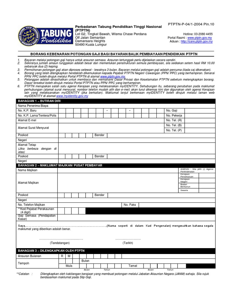 Mulai september 2015 semua penjawat awam yang menerima pinjaman ptptn diwajibkan membuat bayaran balik pinjaman melalui potongan gaji. 03 2193 3000 faks. Borang kebenaran potongan gaji bagi bayaran balik pinjaman pendidikan ptptn 5. Borang yang telah lengkap diisi hendaklah dihantar ke cawangan.