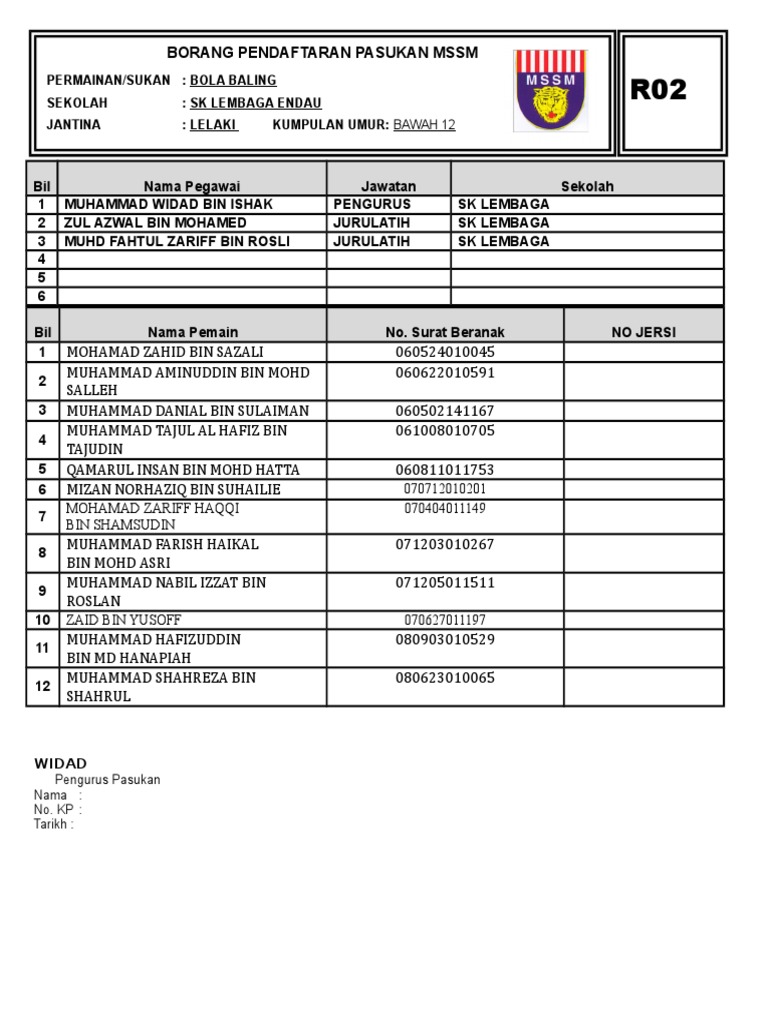 Borang r02 2018. 7 1 1 setiap pemain mesti mendaftar dalam borang pendaftaran pemain r01 r02 e kejohanan dan r03 bagi bawah 12 tahun dan m02 dan m03 bagi bawah 15 tahun dan 18 tahun. Julai 25 julai 2012 rabu. Saridan abd hamid no tel. Mssm r02 sekolah rendah dan m02 sekolah menengah.