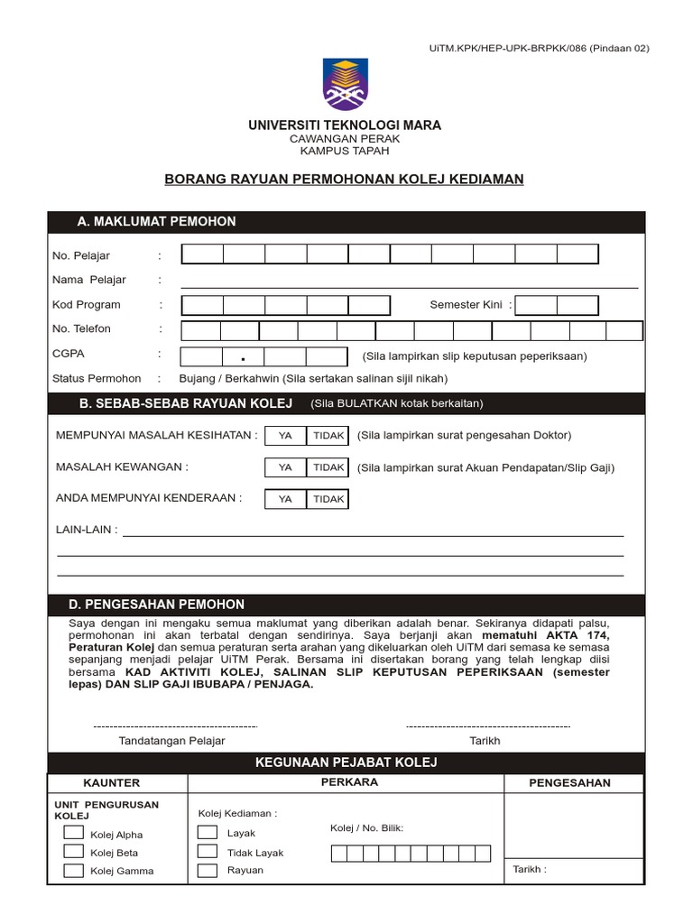 Pendaftaran pelajar berjaya rayuan akan dijalankan di kolej yang ditetapkan seperti maklumat berikut. Berikut merupakan maklumat iklan kerja kosong yang ditawarkan oleh majikan terlibat. Permohonan jawatan kosong universiti teknologi mara uitm. Borang rayuan meneruskan pengajian rmp.