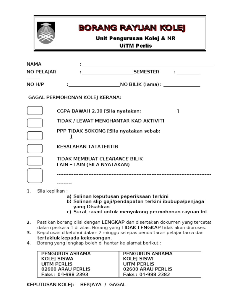 Borang permohonan maklumat kursus dan program akademik. Borang permohonan rayuan kemudahan kolej kediaman. 27 jun 2020 sabtu 23 julai 2020 khamis hebahan keputusan pada 31 julai 2020 jumaat jam 5 00 petang. Pastikan anda mengisi semua ruangan wajib yang bertanda 3.