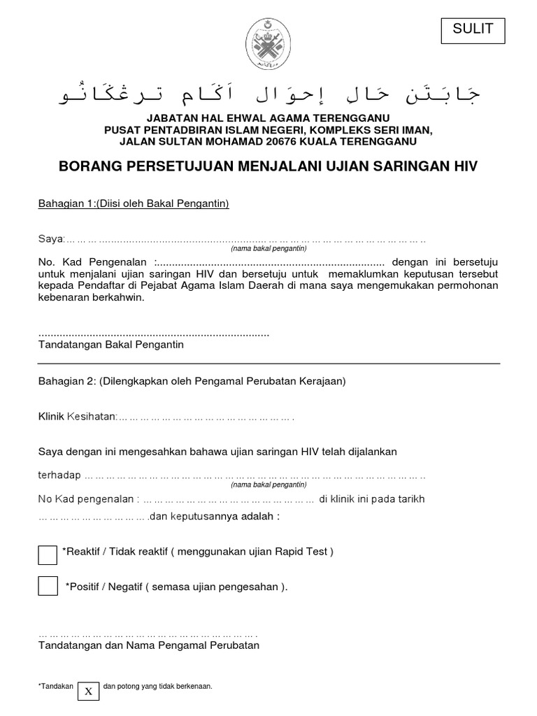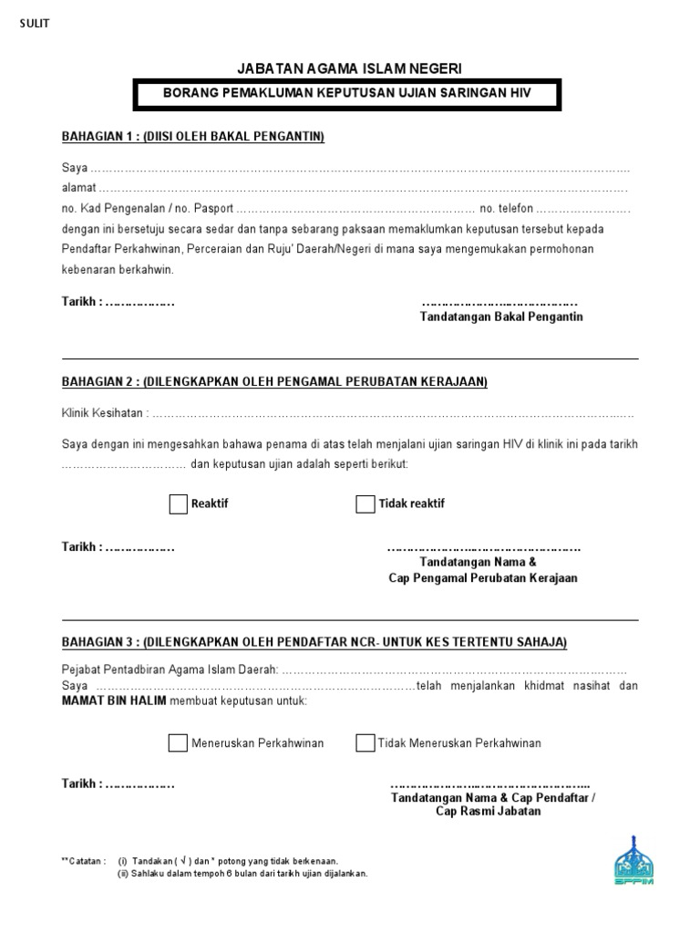 Tempat menjalani ujian hiv hanya klinik kesihatan kerajaan sahaja yang dibenarkan menjalankan ujian tersebut. Borang tertib susunan wali. Sulit jabatan agama islam negeri bahagian 1. Borang permohonan kad perakuan nikah.