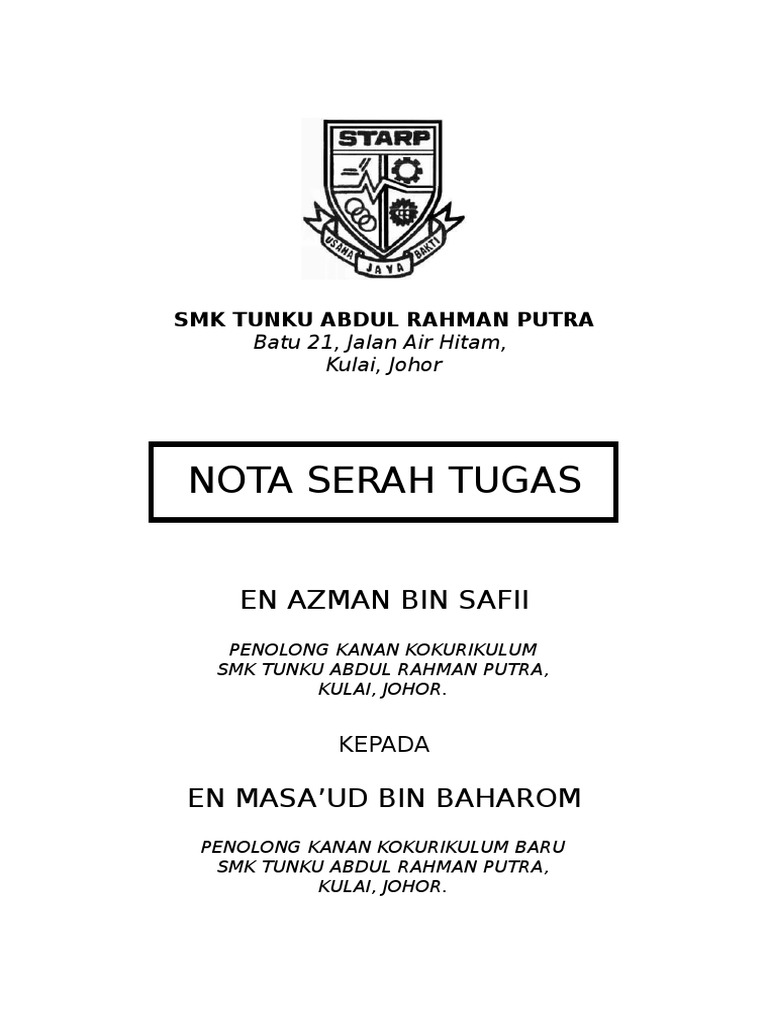 Rahman yang memegang jawatan guru besar di sekolah kebangsaan seri separap batu pahat johor dari tarikh 16 november 2007 bersama ini menyerahkan nota serah tugas sepertimana diarahkan oleh jabatan perkhidmatan awam melalui surat bilangan jpa 193 6 3 4 20 bertarikh 19 julai 1985. Contoh nota serah tugas via cikgufareez my surat serah tugas kokurikulum documents tips via documents tips. Nota serah tugas nota serah tugas nota serah tugas nota serah tugas nota serah tugas nota serah tugas 4 kedudukan kewangan akaun dan lain lain hanya perlu disediakan oleh pegawai pegawai yang berkaitan sahaja. Xxxxxxxxxxxxxxxxxxxx dari tarikh 15 januari 2007 hingga 16 januari 2015 bersama sama ini menyertakan nota serah tugas seperti yang diarahkan oleh jabatan perkhidmatan awam melalui surat bil.