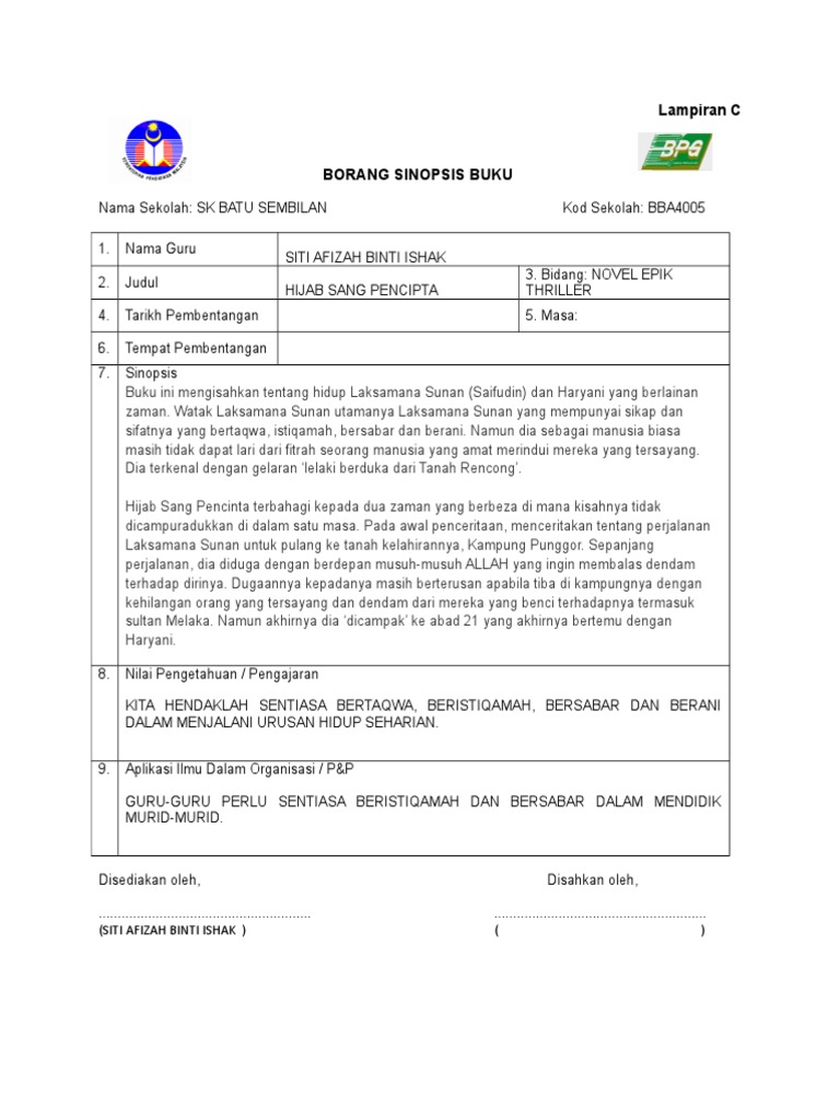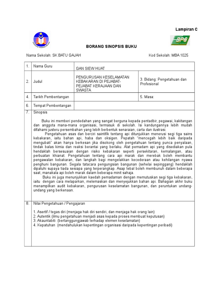 Borang sinopsis buku bpg. ø ulasan buku mestilah merangkumi 3 aspek iaitu i sinopsis buku ii pengetahuan pengajaran yang boleh diperolehi iii aplikasi ilmu dalam organisasi p p. Tarikh pembentangan 16 mac 2020 5. Pengukuran dan penilaian pendidikan. Borang sinopsis buku nama sekolah.