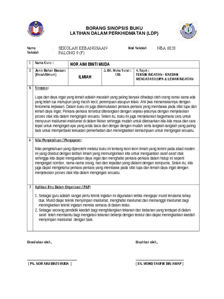 Borang sinopsis buku latihan dalam perkhidmatan ldp nama sekolah 1 2. Smk sungai lembing 1. Teknik ingatan kaedah mengatasi lupa lemah ingatan. C c.