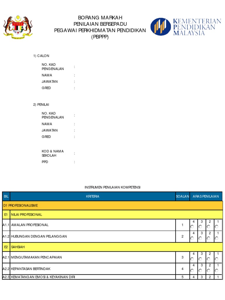 Potong yang tidak berkenaan. Pt a perlu mengemukakan dokumen berkaitan fail pelan pembangunan profesionalisme berterusan pppb sebagai evidens semakan bahan pbppp kepada pp1 pp2. Item semakan bahan bergantung kepada perbincangan antara pyd dan pp. Penilaian bersepadu pegawai perkhidmatan pendidikan pbppp adalah satu kaedah penilaian yang menilai kompetensi dan potensi pegawai perkhidmatan pendidikan ppp berdasarkan konsep tugas dan tempat bertugas job based and work place mengikut standard prestasi yang ditetapkan selaras dengan program transformasi kerajaan gtp 2 0 dan pelan pembangunan pendidikan malaysia 2013 2025.