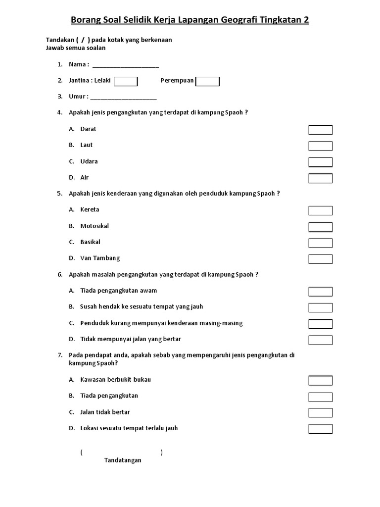 Borang soal selidik bagi setiap item sila bulatkan untuk menyatakan related posts to contoh borang kaji selidik pengangkutan awam contoh borang kaji selidik pengangkutan awam 2016 12 12t10 21 00 08 00 rating. Ini pula contoh borang soal selidik geografi pt3 2015 sebagai rujukan tambahan kepada anda. Berikut dikongsikan contoh borang soal selidik geografi pt3 2018 yang boleh dijadikan panduan dan rujukan buat pelajar dalam menyiapkan kerja kursus folio geografi pt3 2018. Pelajar tingkatan 3 perlu menyiapkan kerja kursus yang merupakan jenis pentaksiran pelbagai instrumen yang terdapat dalam peperiksaan pt3.