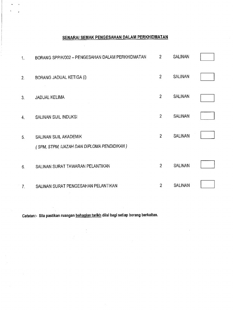 Pengesahan dalam perkhidmatan dilaksanakan berdasarkan peraturan 29 peraturan peraturan pegawai awam pelantikan kenaikan pangkat dan penamatan perkhidmatan 2012 p u. Bagi membolehkan seseorang pegawai disahkan dalam perkhidmatan pegawai perlu memenuhi semua syarat yang dinyatakan dalam skim perkhidmatan atau apa apa syarat. Senarai semak perakuan urusan pengesahan dalam perkhidmatan lampiran c. Suruhanjaya perkhidmatan pelajaran malaysia bahagian perkhidmatan pengesahan dalam perkhidmatan arahan untuk kegunaan spp rujukan fail borang perakuan pengesahan dalam perkhidmatan subperaturan 29 2 dalam perkhidmatan kerana telah menjalankan tugasnya dengan jujur spp strategic partners.