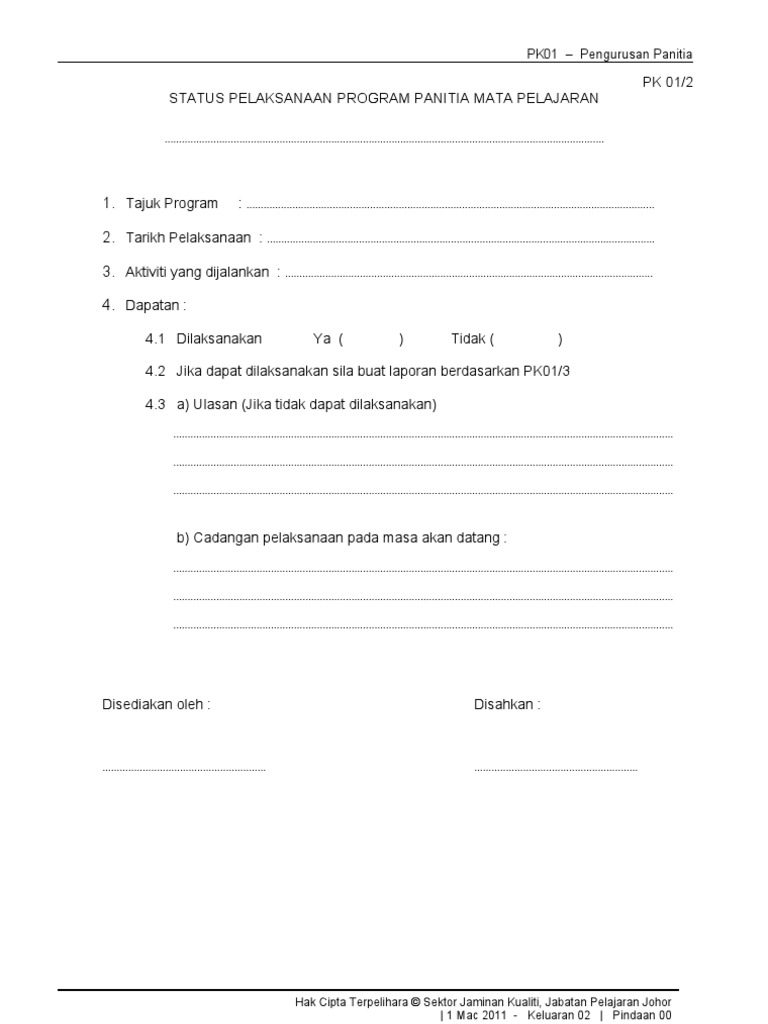 Borang spsk pk 01 2 laporan perlaksanaan program panitia mp pk01 3 program peningkatan matapelajaran 2. Pk 02 pengurusan jadual waktu guru jadual waktu. Pk01 3 format laporan. Cover fail manual kualiti spsk cover lampiran manual kualiti spsk cover pengesahan dokumen definisi singkatan isi kand.